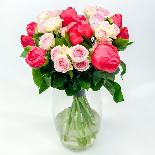 Кустовые розы и пионы, ничего лишнего, просто идеальный букет в розово-красной гамме для любого повода! Вы можете выбрать из размеров: S (ø 25 см), M (ø 30 см), L (ø 35 см), XL (ø 45 см), XXL (ø 55 см). Высота букета ~ 35 см. Ваш букет будет упакован в крафт-бумагу или дизайнерскую цветную бумагу по вашему выбору.