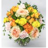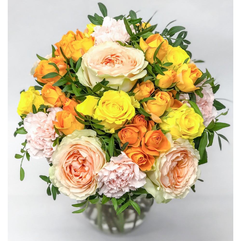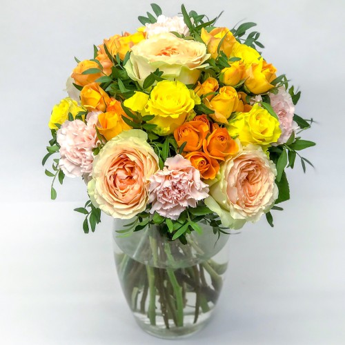 Яркий и жизнеутверждающий букет в желтых, оранжевых и розовых тонах. Вы можете выбрать из размеров: S (ø 25 см), M (ø 30 см), L (ø 35 см), XL (ø 45 см), XXL (ø 55 см). Высота букета ~ 35 см. Ваш букет будет упакован в крафт-бумагу или дизайнерскую цветную бумагу по вашему выбору.