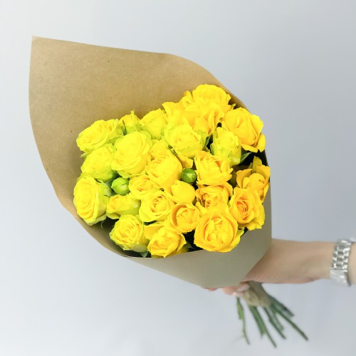 Настоящее солнце в упаковке – мини-букет из 9 желтых кустовых роз. Вы можете выбрать количество цветков в букете (от 9 до 49 шт.). Ваш букет будет упакован в крафт-бумагу или дизайнерскую цветную бумагу по вашему выбору.